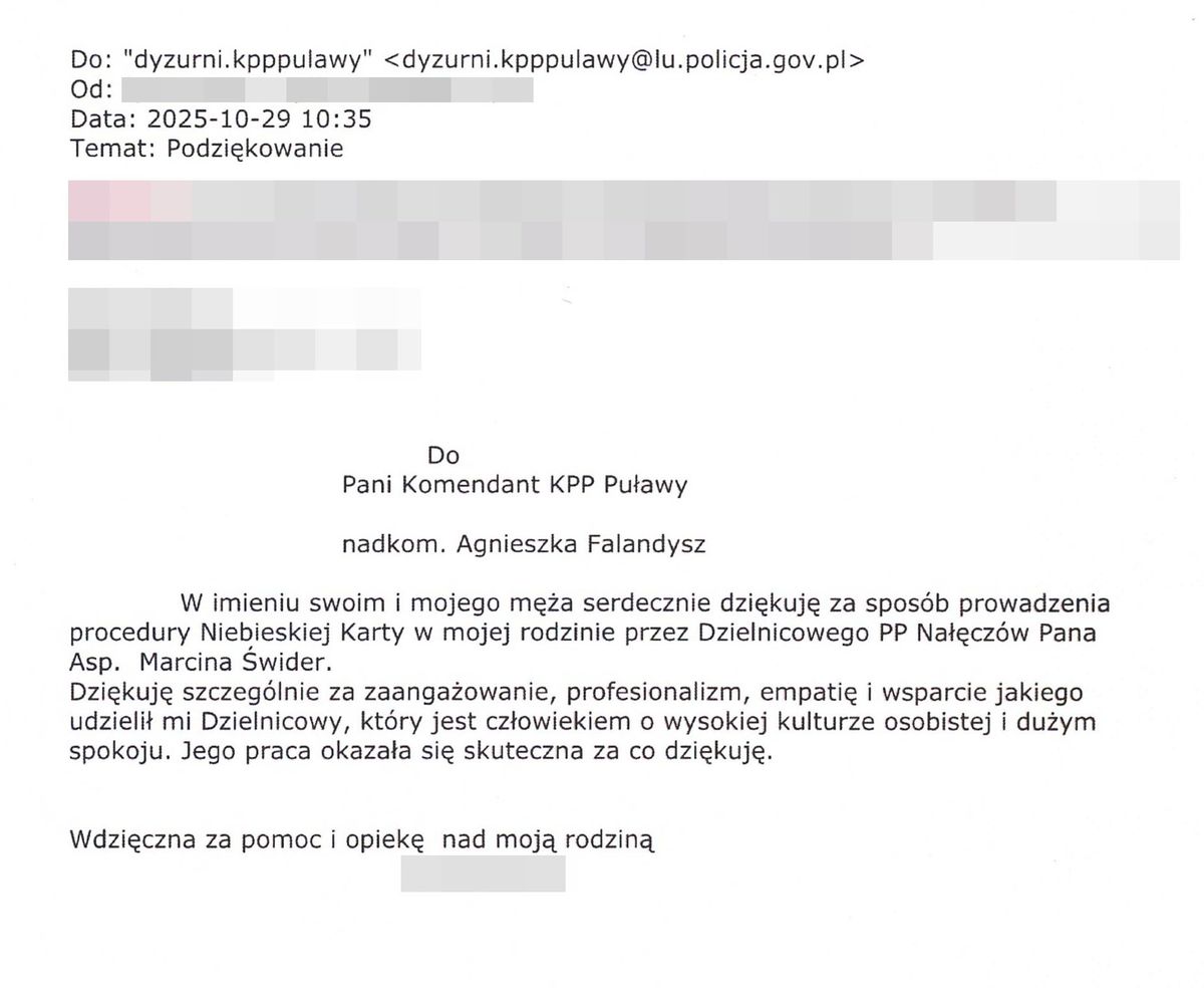 Do Komendanta Powiatowego Policji w Puławach wpłynęły podziękowania dla dzielnicowego z Posterunku Policji w Nałęczowie aspiranta Marcina Świdra. Mieszkanka gminy Nałęczów dziękuje naszemu funkcjonariuszowi za pomoc i opiekę nad jej rodziną w ramach prowadzonej procedury Niebieskie Karty.