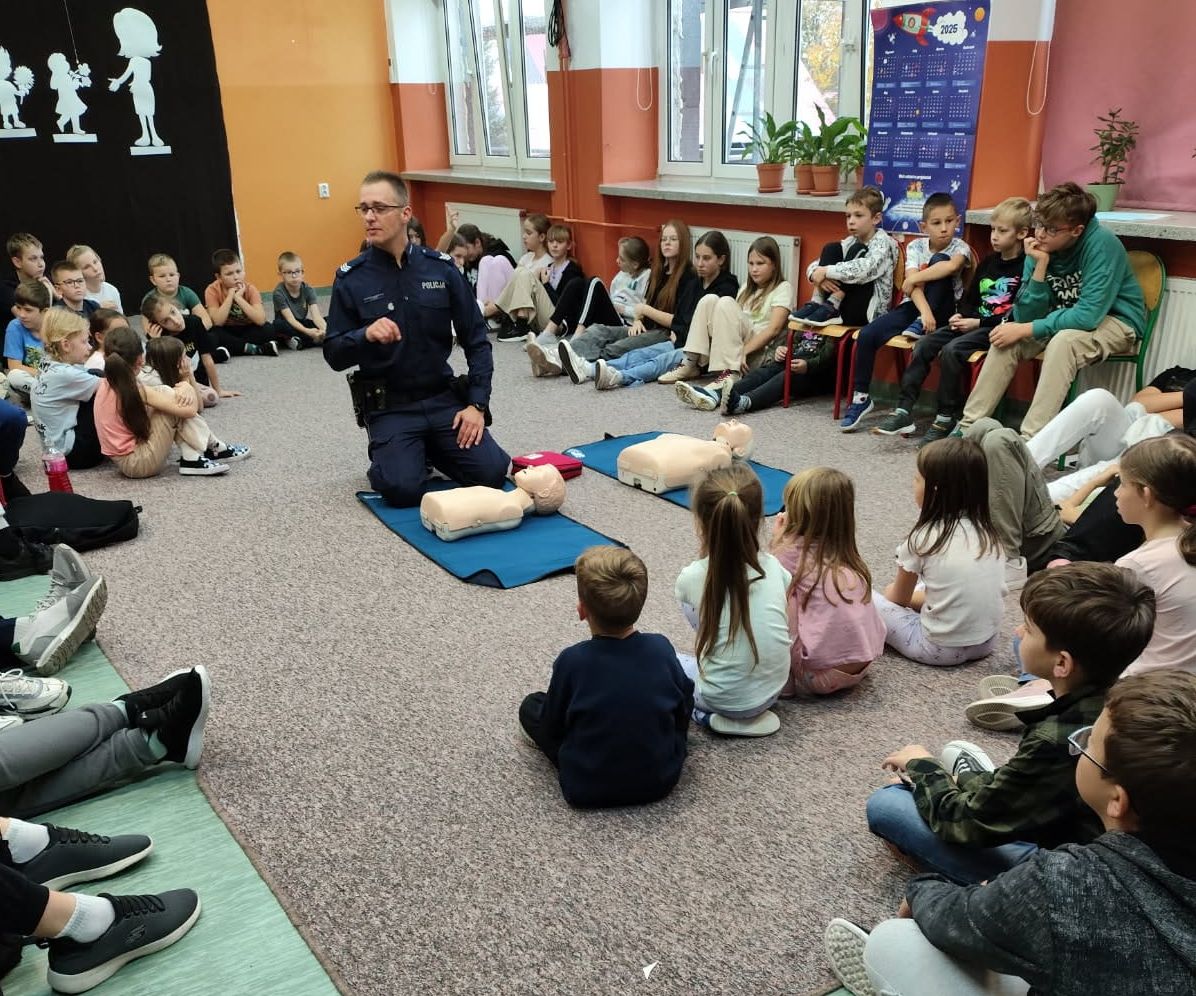 Policjant z Komisariatu Policji w Kurowie sierż. szt. Łukasz Kęsik spotkał się z uczniami szkół podstawowych z terenu gminy Żyrzyn, aby porozmawiać z nimi o bezpieczeństwie oraz przećwiczyć udzielanie pierwszej pomocy przedmedycznej. Spotkania były nie tylko okazją do edukowania najmłodszych, ale też stworzeniem im przestrzeni do zadawania pytań i rozwiewania wątpliwości dotyczących szeroko pojętego bezpieczeństwa.