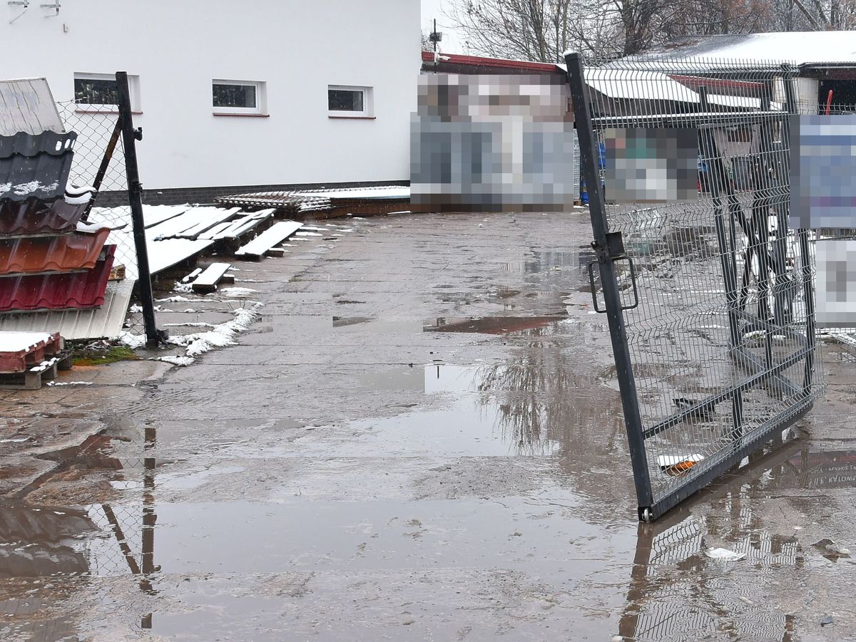 Następnie busem, który miał podpiętą przyczepkę do przewożenia drutu wyjechał z terenu hurtowni, uszkadzając po drodze stojaki na blachę i taranując bramę.