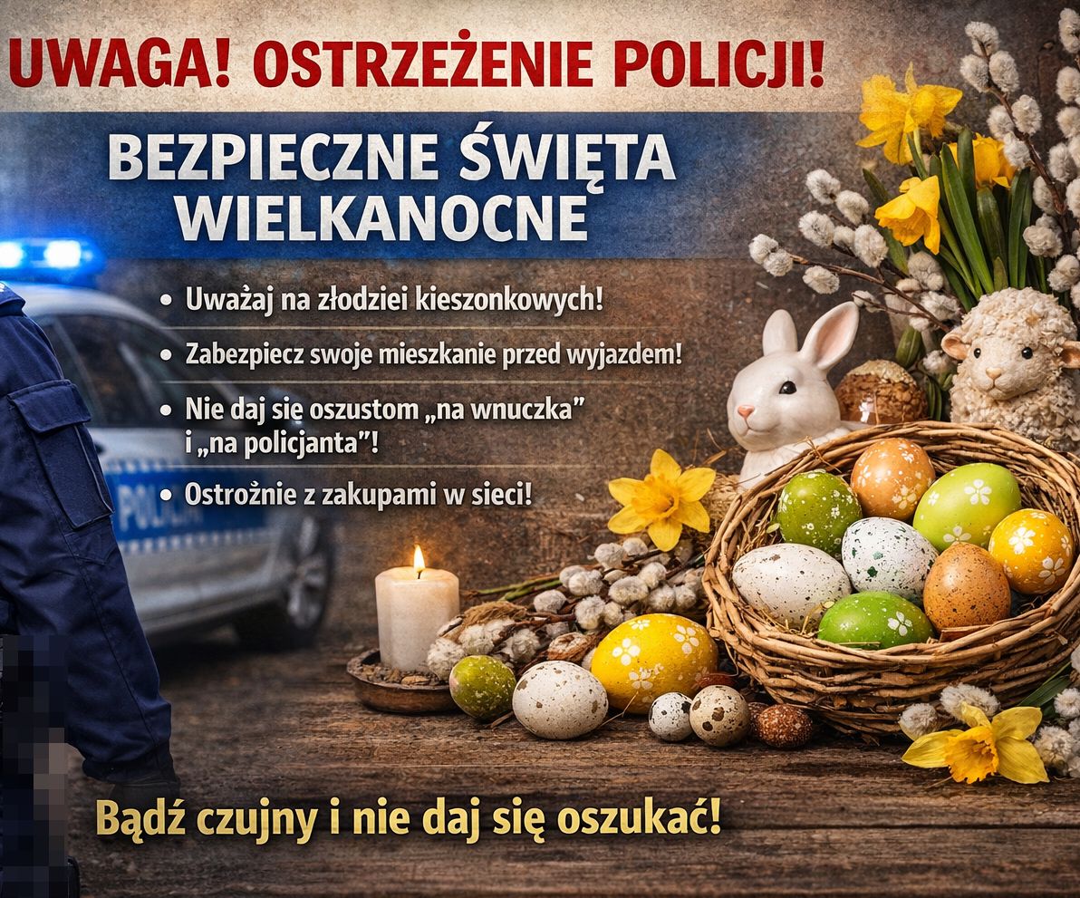 W związku ze zbliżającymi się Świętami Wielkanocnymi Komenda Powiatowa Policji w Puławach apeluje do mieszkańców o zachowanie szczególnej ostrożności i rozwagi. W trosce o bezpieczeństwo przypominamy o podstawowych zasadach: